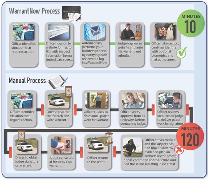 The differences between how a warrant is processed with and without the use of WarrantNow are vast. The time and resources used for the outdated, traditional process are unpredictable and can have implications on the budgets of Law Enforcement Agencies, both large and small. The savings realized with WarrantNow far outweigh the subscription price, as can be clearly seen when the two processes are compared side by side.